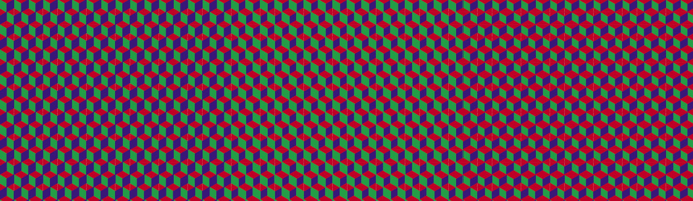 Ещё пример определения цвета «в среднем» показан на рисунке 6. Почему он кажется разбитым на три квадрата? Если пристально рассмотреть картинку, можно заметить, что в правой её части красные ромбы чуть толще остальных, в центральной её части зелёные ромбы чуть толще, а в левой — синие. Однако мозгу не нужно разбираться в таких деталях: он видит, что справа красного цвета пришло в сумме больше, чем других цветов, и выделяет красноватый квадрат. Тем самым он делит картинку на три квадрата и видит, что правый квадрат в среднем краснее других, центральный — зеленее, а левый — синее.