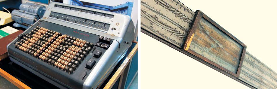 Механический калькулятор «Мерседес» (Музей ядерного оружия РФЯЦ-ВНИИЭФ) и логарифмическая линейка — инструмент физика-теоретика и математика (предоставлена академиком Ю. А. Трутневым, разработчиком термоядерных зарядов). 1951 г.