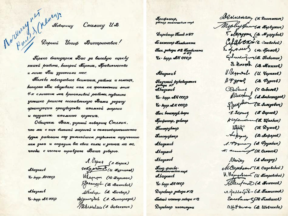 Письмо И. В. Сталину от Л. П. Берии, ученых и специалистов с благодарностью за высокую оценку работы в области производства атомной энергии и создания атомного оружия [4, с. 660]