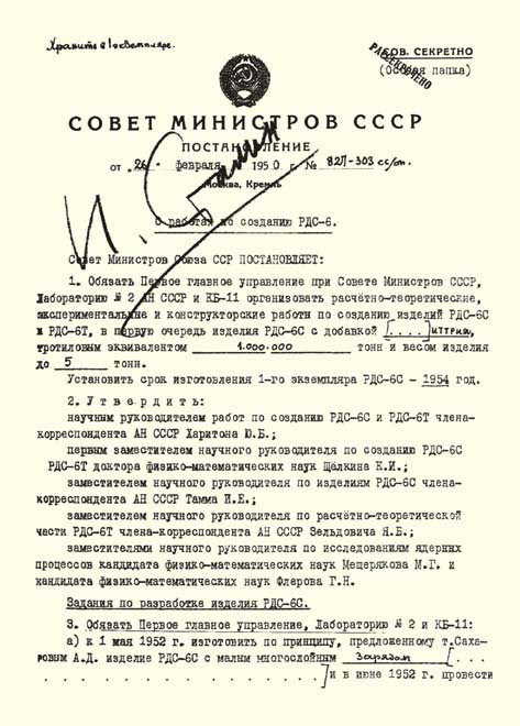 После получения новых разведданных по сверхбомбе и о новых конструкциях атомных бомб от Берии мгновенно последовало указание Харитону дать заключение. Уже 10 июня 1948 г. были приняты два постановления Совета министров СССР, которые на государственном уровне дали новый импульс работам по термоядерным зарядам в нашей стране. В них был указан конкретный срок (к 1 июня 1949 г.) для проработки осуществимости конструкции с жидким дейтерием (она получила индекс РДС-6), помещенным в цилиндрический сосуд — трубу. Интегратором этого проекта назначалось КБ-11 при Лаборатории № 2 АН СССР. В постановлении было указано: Расчетно-теоретические работы должны были проводиться по заданиям и под руководством Ю. Б. Харитона и Я. Б. Зельдовича в КБ-11, в МИАН, в Ленинградском отделении МИАН (группа Канторовича). Институт геофизики АН СССР (Тихонов) должен производить расчеты по заданиям ИФП (Ландау). ФИАН должен был разработать теорию горения трития (дейтерия) по заданиям Харитона и Зельдовича. Для решения этой задачи в ФИАНе была организована группа под руководством И. Е. Тамма в составе С. З. Беленького, В. А. Фока, А. Д. Сахарова и Ю. А. Романова [5, с. 121]. В постановлении детально прописывались не только сроки, но и условия материального стимулирования: размеры премий, выделение квартир и комнат в Москве.