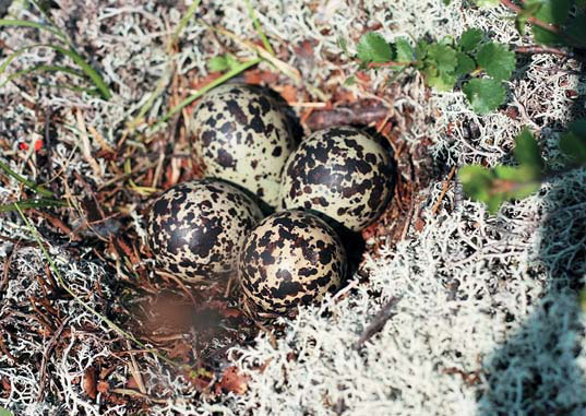 Найти гнездо ржанки совсем не просто, птицы заблаговременно сходят с кладки и не садятся насиживать, пока не убедятся, что опасность миновала. Гнездо устраивается на земле среди тундры, обычно достаточно сухой, часто на водоразделах или где-то поблизости. В одних случаях оно хорошо сформировано, в других представляет собой простое углубление в лишайниково-моховой подушке. Лоток выстилается лишайниками из группы ягелей: в обнаруженных нами гнездах присутствовали Cladonia arbuscula и Flavocetraria cucullata. В кладке бывает четыре (редко — три) яйца довольно изменчивой окраски. При обследовании хребта Чувальский Камень 4 июля 2006 г. во время дождя со снегом я натолкнулся на ржанку, насиживающую кладку с тремя яйцами. Птица покинула гнездо прямо передо мной. Вероятно, кладка была еще не полной. Гнездо возле горы Хусойк хребта Муравьиный с четырьмя яйцами обнаружено 13 июля 2007 г. Неоднократно приходилось встречать и старые гнезда — ямки, выстланные лишайником. Так, 30 июля 2005 г. было найдено на хребте Ольховочном гнездо с фрагментами скорлупы и одним «болтуном», а 14 августа 2005 г. такое же гнездо — на хребте Зыряновский камень.