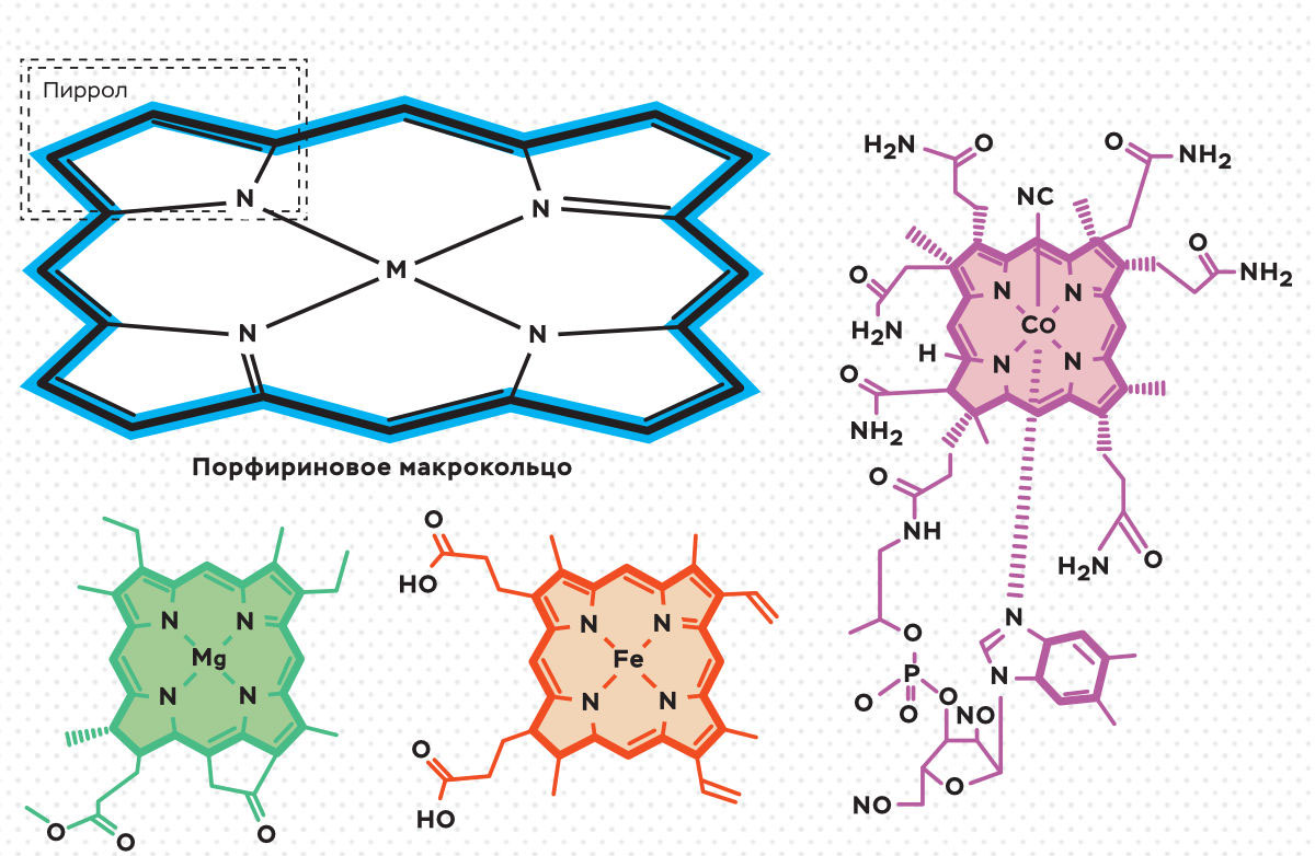 Само это слово, происходящее от греческого πορφυρα — ‘пурпурный’, не на слуху, хотя представители порфиринов также хорошо известны. Прежде всего, это содержащие магний зеленые пигменты растений — хлорофиллы, вещества, играющие одну из ключевых ролей в процессе фотосинтеза. Другой пример — содержащий железо красный пигмент крови — гем b. В составе белка гемоглобина гем переносит кислород, а в составе других белков — цитохромов — гем отвечает за важные процессы метаболизма. Содержащий кобальт витамин В12 действует как переносчик групп между молекулами органических веществ в биосинтезе, его недостаток в организме вызывает тяжелые анемические заболевания.