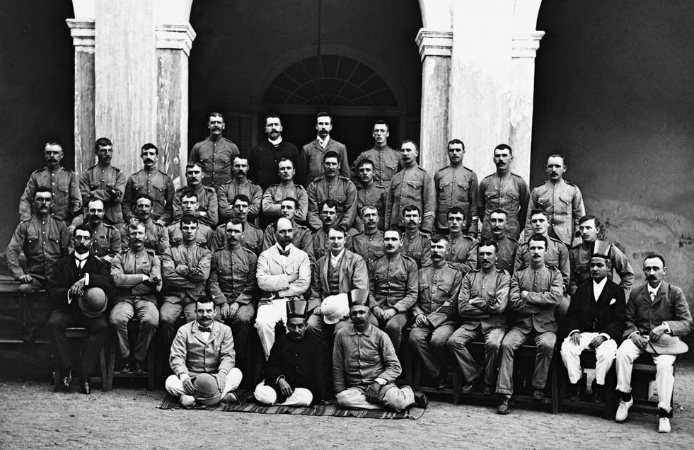 Хавкин (во втором ряду в центре, со светлым пробковым шлемом) с сотрудниками Противочумной лаборатории в Бомбее. Индия, 1902–1903 гг.