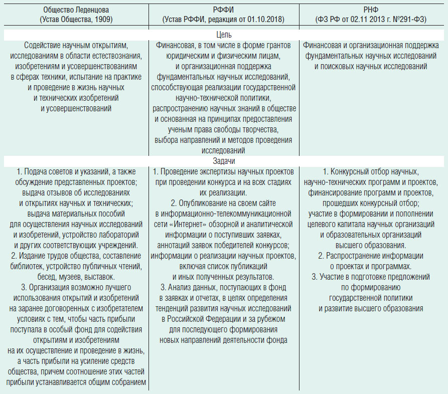 Любопытно отметить, что цель и задачи общества Леденцова во многом схожи с теми, что указаны в соответствующих уставных параграфах Российского фонда фундаментальных исследований (РФФИ) и Российского научного фонда (РНФ) — современных организаций, деятельность которых направлена на финансовое обеспечение научной и научно-технической деятельности (табл. 2).