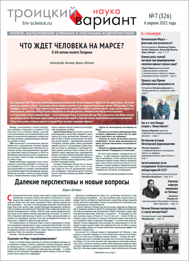 Владимир Сурдин, канд. физ.-мат. наук, ст. науч. сотр. ГАИШ МГУ: Если говорить об изучении Марса в ближайшие десятилетия, то я скептически отношусь к пилотируемым полетам и созданию обитаемой базы на Красной планете. Изучение Марса — это грандиозный научный эксперимент; очень важный и очень дорогой. Такие эксперименты требуют многофакторного планирования. Взвесим некоторые факторы...