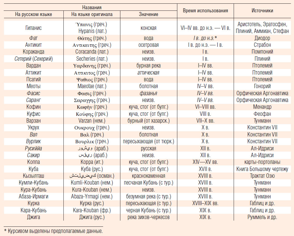 Таблица 1. Старинные названия р. Кубани и ее рукавов [1, 4, 5, 19]