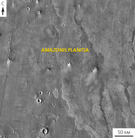 Рис. 5. Типичная амазонийская поверхность в области равнины Амазония (Amazonis Planitia). Главную роль в строении поверхности играют протяженные лавовые потоки, в слабой степени затронутые ударными кратерами. Фрагмент глобальной фотомозаики, полученной тепловым спектрометром THEMIS. Центр снимка находится на 17,19° с. ш., 156,59° з. д.