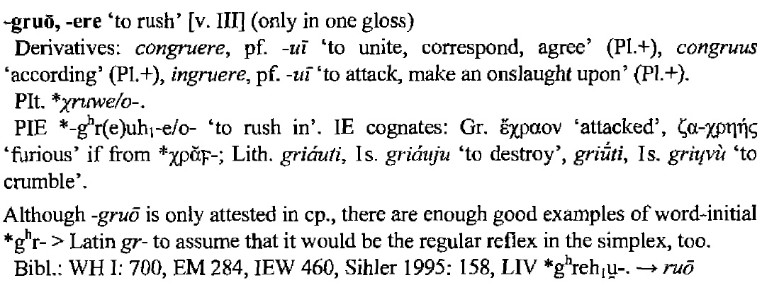 На всякий случай уточню, что я понимаю знак равенства в Вашей записи «gruo = ruo» как утверждение, что слово (часть слова) слева от этого знака происходит от того же корня, что слово справа от этого знака. В таком случае нам нужно объяснить, почему они фонетически различаются на один звук. В приводимой Вами словарной статье сказано «rafforzato da G», но это по сути просто пересказанное другими словами описание этого различия на один звук. Какой бы то ни было процесс «усиления» корней с помощью звука g в истории латинского языка, который бы подтверждался хотя бы несколькими примерами, неизвестен, а значит, это аргумент ad hoc, открывающий ящик Пандоры: так можно связывать между собой любые слова любого языка, различающиеся наличием/отсутствием одного звука (склон и слон, нем. grau и rau и т. д.). Словарю Пьяниджани столетней давности подобные построения простительны, но современная лингвистика такого не допускает: все наши знания об истории человеческих языков свидетельствуют о том, что добавления произвольных звуков в произвольно взятые слова не бывает. Гораздо резоннее считать, что это просто два разных корня — как, например, сделано в новом этимологическом словаре de Vaan’а (2008), скриншоты из которого прилагаю: там эти слова возводятся к индоевропейским корням -ghr(e)uh1- и -h3reu- с фонетически закономерными параллелями из других языков (перекрёстные ссылки в конце словарных статей не обозначают родства, а являются просто отсылками, необходимыми потому, что гипотеза gruo = ruo высказывалась).