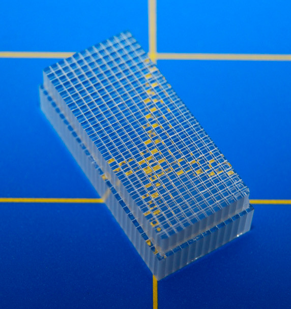 Прозрачный кристалл LYSO компании Saint-Gobain лежит на зеркальной подложке и размечен для разрезания на отдельные детекторы миллиметрового размера. Фото: Saint-Gobain