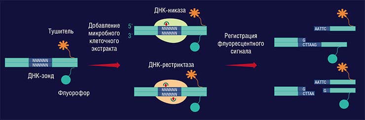 Для определения активности ферментов рестрикции в клеточном бактериальном экстракте используют ДНК-зонды с флуоресцентной меткой. Для детекции применяют метод флуоресцентного резонансного энергетического переноса (FRET). В этом случае детектирующая молекула содержит разные метки-красители – донора (флуорофор) и акцептора (тушитель флуоресценции). Характерной чертой переноса энергии от донора к акцептору является тушение флуоресценции первого и возникновение более длинноволновой флуоресценции второго. Скорость этого процесса зависит от расстояния между объектами. Расщепление ДНК-зонда приводит к появлению флуоресцентного сигнала за счет пространственного отдаления тушителя и флуорофора