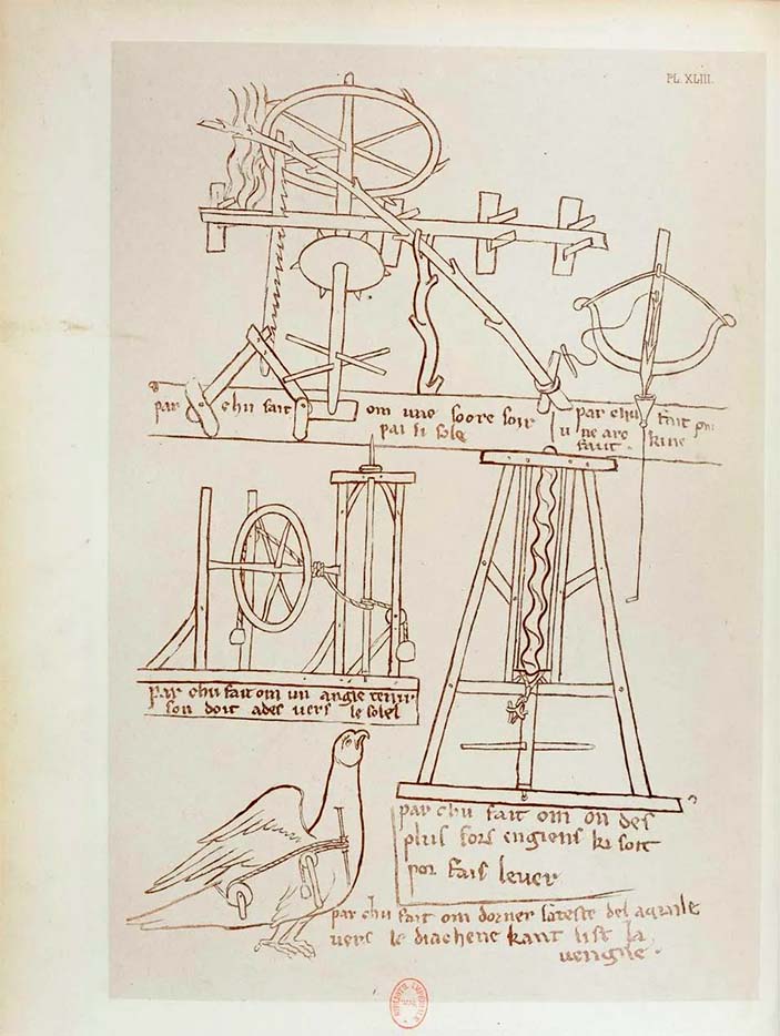 Среди механических устройств, чертежи которых набросал Виллар, встречаются подъемные устройства, арбалет, пила с водяным приводом и ряд автоматов. Механизмы, изображенные на рисунке № 43, пожалуй, имеют особое значение для историков техники. Эта коллекция машин включает автоматическую лесопилку, которую приводит в действие посредством зубчатой передачи колесо, аналогичное тому, что используют в водяных мельницах. Тут же изображен усовершенствованный арбалет с не совсем понятным механизмом действия, «который никогда не промахивается», как следует из приписки мастера. Далее ангел, который всегда указывает на солнце. Механизм ангела расположен непосредственно под рисунком пилы с гидравлическим приводом. Текст под рисунком объясняет, «как заставить ангела всегда указывать пальцем на солнце». Помещенный на крышу церкви или часовни, ангел медленно прослеживает направление солнца. Из рисунка не совсем ясно, как именно будет работать автомат, за исключением того, что механизм подразумевает вращательное движение, регулируемое весом гирь. Механизм снабжен системой канатов и шкивов с грузами, которые, в свою очередь, намотаны на ось и колесо. Элемент, спрятанный внутри орла, изображенного внизу той же страницы, очевидно, разработан в соответствии с тем же принципом и тоже управляется весом гирь, как и ангел. У птицы внутри была система грузов, веревок и блоков; они заставляли птицу поворачивать голову к дьякону во время чтения Евангелия. Вероятно, птица сидела на кафедре, взирая то на чтеца, то на его аудиторию. И вращающийся ангел, и птица кажутся, по крайней мере на рисунках, довольно примитивными. Из чертежа совсем не ясно, как система канатов и шкивов с приводом от гирь повернула бы голову орла. Скуповатый характер этих технических чертежей выглядит особенно примечательно в сравнении с относительно подробной спецификацией конструкции гидравлической пилы, которая приведена на том же листе. Учитывая краткость подписей и стиль рисунка, эти два чертежа автоматов в альбоме Виллара могут оказаться всего лишь мысленными экспериментами, а не реальными изысканиями. В лучшем случае они представляют собой технические эскизы, имеющие какой-то смысл лишь для людей, уже знакомых с нарисованными предметами — для непосвященных чертежи бесполезны. Тем не менее они говорят о возможности воспроизведения естественных процессов с помощью механизмов (движения объектов) и отслеживания небесных явлений (пути солнца по небу). В целом они похожи —особенно птица — на эллинистические автоматы Герона Александрийского, а также на автоматы из раннесредневековой Византийской империи и халифата Аббасидов. Однако Виллар вряд ли имел доступ к работе Герона «Пневматика» или трактату аль-Джазари, которые еще не были доступны на латыни или французском в начале XIII века.