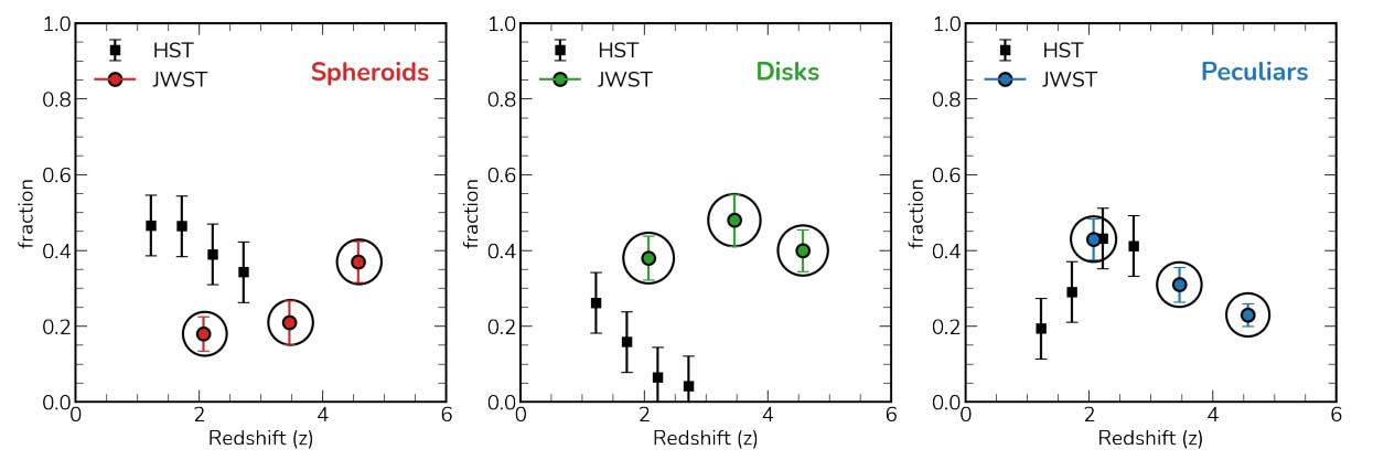 3. Реально интересные результаты касаются формы далеких галактик, хотя и не относящихся к самой ранней Вселенной4 . Авторы не без иронии назвали статью «Паника! По поводу дисков! Первые оптические наблюдения структуры галактик в их собственной системе отсчета...» («Panic! At the Disks: First Rest-frame Optical Observations of Galaxy Structure at z > 3 with JWST in the SMACS0723 Field»). Раньше форму далеких галактик оценивали по снимкам «Хаббла», который видит только их ультрафиолет из-за большого красного смещения. JWST снимает в инфракрасном диапазоне, что соответствует максимуму светимости звезд в системе отсчета галактики. Оказалось, что большинство тех галактик, которые по снимкам «Хаббла» принимали за сфероиды, оказались дисками. В работе по наблюдениям на ALMA проанализировано поле зрения, снимок которого дан на фото ниже. Доля галактик разных морфологических типов дана на графике. Сферических галактик по данным JWST оказалось в два раза меньше (при z ~2–3, там, где можно сравнивать), доля дисков — намного выше, доля неправильных галактик сравнима.
