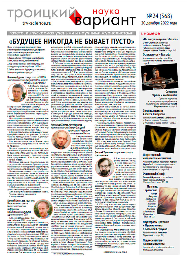 После некоторых колебаний мы все-таки решили провести традиционный декабрьский опрос ученых и популяризаторов науки. Вопросы были заданы такие: 1. Какие события 2022 года в вашей области науки, на ваш взгляд, наиболее важны? 2. Над чем вы работали в этом году? Над чем планируете продолжать работу в 2023-м? 3. Сейчас для многих будущее пусто иль темно. Вы видите проблеск надежды?