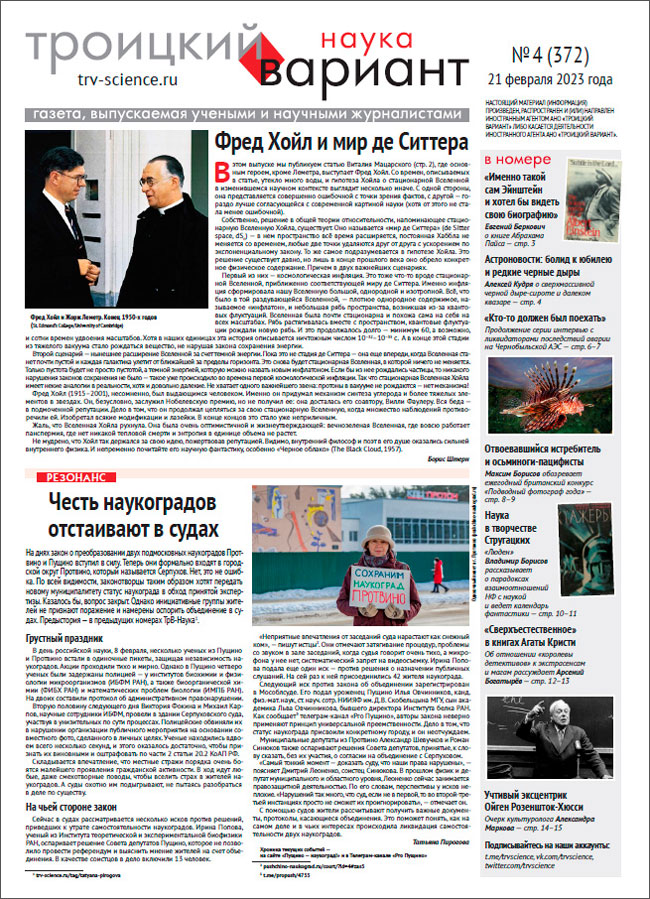 В этом выпуске мы публикуем статью Виталия Мацарского (стр. 2), где основным героем, кроме Леметра, выступает Фред Хойл. Со времен, описываемых в статье, утекло много воды, и гипотеза Хойла о стационарной Вселенной в изменившемся научном контексте выглядит несколько иначе. С одной стороны, она представляется совершенно ошибочной с точки зрения фактов, с другой — гораздо лучше согласующейся с современной картиной науки (хотя от этого не стала менее ошибочной)...