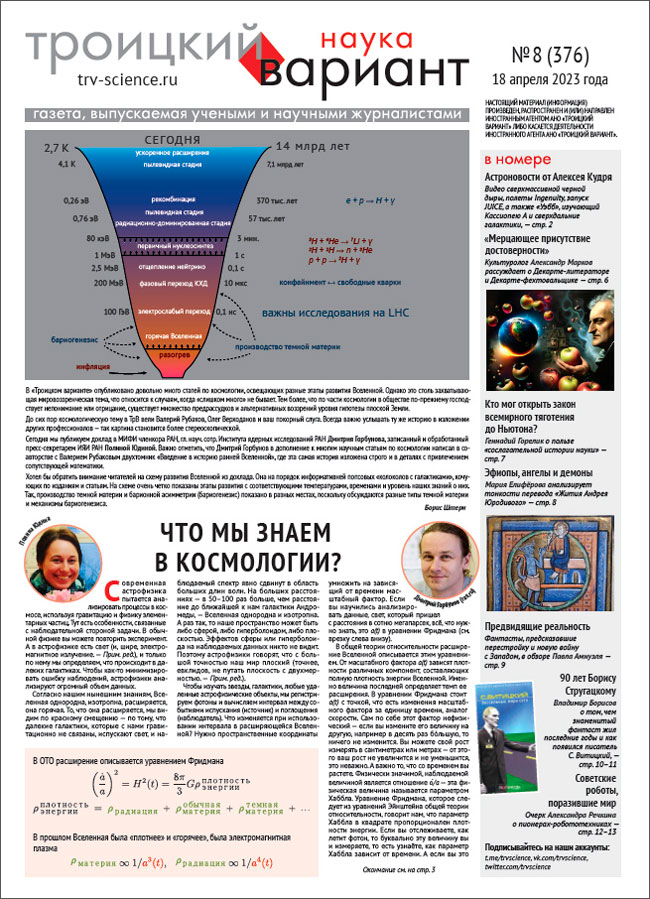В ТрВ опубликовано довольно много статей по космологии, освещающих разные этапы развития Вселенной. Однако это столь захватывающая мировоззренческая тема, что относится к случаям, когда «слишком много» не бывает. До сих пор космологическую тему в ТрВ вели Валерий Рубаков, Олег Верходанов и Борис Штерн. Всегда важно услышать ту же историю в изложении других профессионалов — так картина становится более стереоскопической. Сегодня мы публикуем доклад в МИФИ членкора РАН, гл. науч. сотр. ИЯИ РАН Дмитрия Горбунова, записанный и обработанный пресс-секретарем ИЯИ РАН Полиной Юдиной.