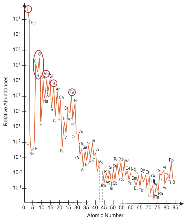 Рис. 1. Земная жизнь использует семь из топ-10 самых распространенных элементов — водород, углерод, кислород, азот, сера, магний, железо