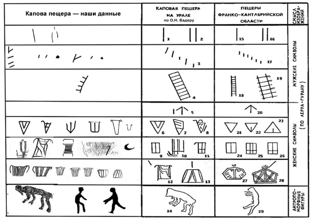 Анализ материала позволяет нам сделать ряд выводов. О. Н. Бадер в своей монографии [1] (см. таблицу) проводил мысль о достаточно высокой степени близости «живописи» Каповой пещеры и западноевропейских аналогов. Нам представляется, что между ними существуют и существенные различия, а сама концепция создания изображений пещеры Шульган-Таш и многие из рисунков и знаков достаточно специфичны и имеют право считаться самобытными в рамках общего мирового культурного поля палеолита. Это прежде всего касается концептуальных различий рисунков первой группы (из Зала Рисунков) и аналогов Западной Европы.