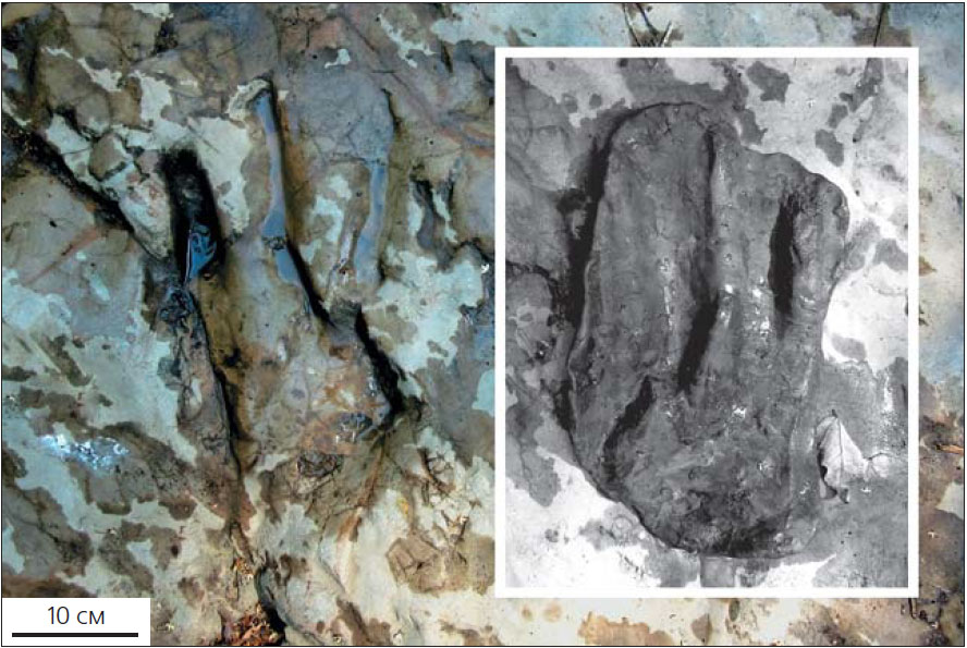 След сегнозавра (макроподозавра) из местонахождения Ольховка-2. Отпечаток стопы на вмещающей породе непосредственно в обнажении и слепок этого же следа (справа на черно-белой врезке).