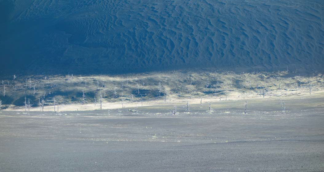 Толбачинский дол. Лиственницы, засохшие на корню от выпавшего горячего шлака в ходе извержения летом 1975 г. Застывшие ветровые шлаковые волны на склоне моногенного вулкана. И вновь появившаяся лишайниковая растительность у его подножия