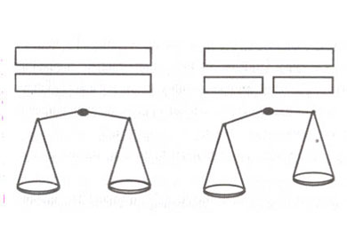 Все варианты выглядят так (гири с разными знаками лежат на разных чашках весов):