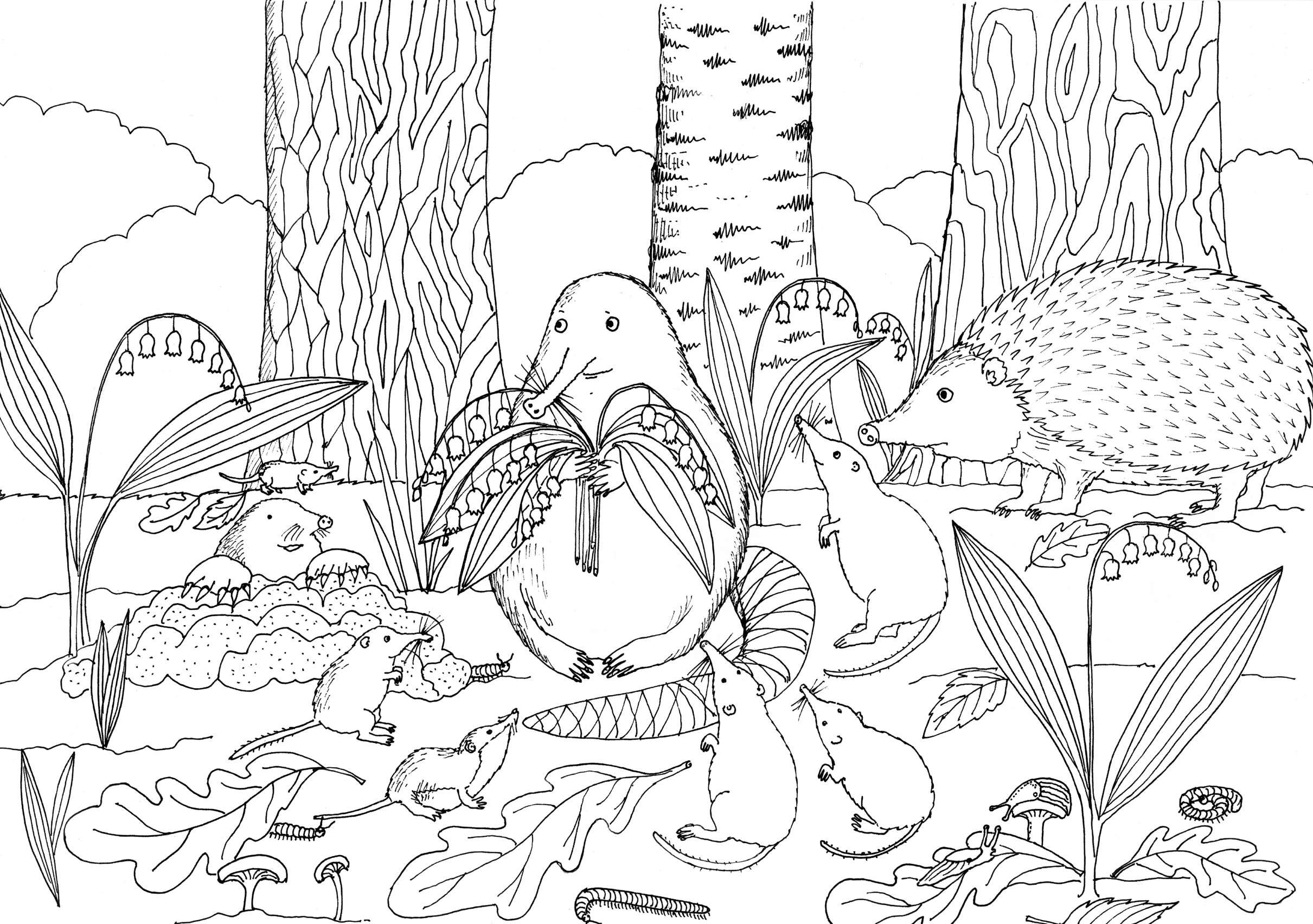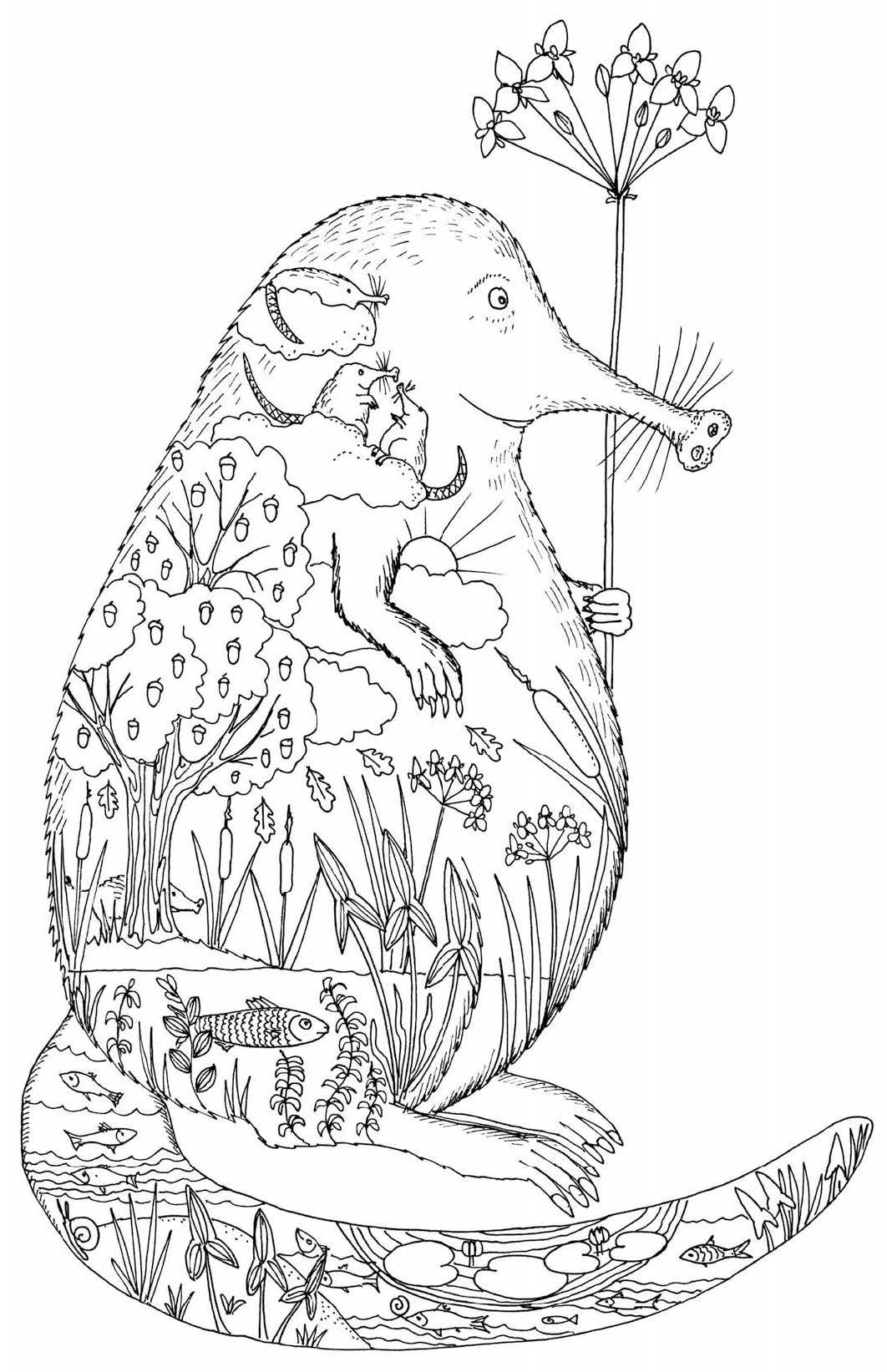 Иллюстрации разнообразны. Вот выхухоли в норке; вот они сидят, обнявшись хвостами, рядом с бобрами и множеством других переживающих половодье животных; вот будто по команде выставили хоботки из воды (меряются с кабаньим пятачком?); вот пируют разными моллюсками, растениями и рыбой, будто охотники на привале. Каждая выхухоль на рисунках Панковой — личность, с узнаваемыми эмоциями в диапазоне от «как не хочется в воду» до «а что это я в вас такой влюбленный?». И это очеловечивание никоим образом не портит текст книги, более житейский и приземленный, посвященный, как ни крути, жизни в дикой природе с неизбежной борьбой за существование, тревогами и заботами. Напротив, эти иллюстрации с текстом идеально сочетаются, делают его более светлым и уютным, и тут даже совершенно не важно, что в книгу они перекочевали из вышедшей ранее авторской книжки-раскраски.