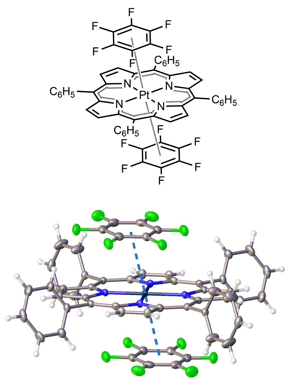 Не так давно наша научная группа совместно с группой академика РАН Ю. Г. Горбуновой синтезировала и детально изучила уникальные супрамолекулярные ансамбли — обратные ареновые сэндвичевые структуры (Angewandte Chemie International Edition, 2019, 58). На рисунке представлена структура такого ассоциата, образованного за счет π-дырочного взаимодействия гексафторбензола с порфирином платины, точнее с выступающей за пределы поверхности dz2-орбиталью иона платины(II).