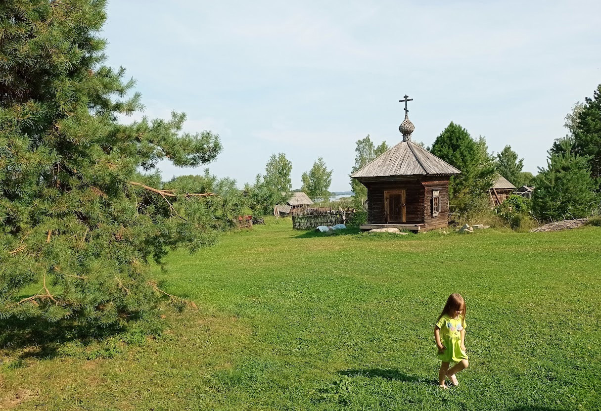 Музей в Учме частный, его основал местный житель Василий. Он человек особый — признавался, что одноклассники его не жаловали, поскольку только он один любил читать книжки. Музей этот, конечно, для «тех, кто понимает», но всё равно пользуется популярностью: летом здесь бывают самые разные люди, в том числе и прикатившие издалека. Одни громко восхищаются Волгой и музеем, другие приезжают поклониться и помолиться — больше пяти веков тому назад здесь поселился Кассиан Грек. Приехал в Московию в свите Софьи Палеолог, да так и остался, обратно не захотел: очень уж здесь хорошо. Вот его и причислили к лику святых, а его мощи, говорят, напрочь унимали зубную боль. Кассиан построил монастырь, где привечал и кормил нищих, но коммунисты уничтожили храмы с таким же успехом, с каким они извели осетров и стерлядей. Так что между рыбой и монастырем образовалась стопроцентная корреляция. А в 1989 году Василий срубил часовенку рядом с могилой Кассиана. Тоже подвиг. Но от него рыбы больше не стало.