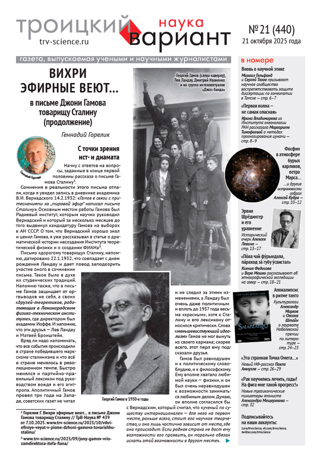 Начну с ответов на вопросы, заданные в конце первой половины рассказа о письме Гамова Сталину. Сомнения в реальности этого письма отпали, когда я увидел запись в дневнике академика В. И. Вернадского 14.2.1932: «Гамов в связи с притеснениями за «мировой эфир» написал письмо Сталину». Основным местом работы Гамова был Радиевый институт, которым научно руководил Вернадский и который за несколько месяцев до того выдвинул кандидатуру Гамова на выборах в АН СССР...