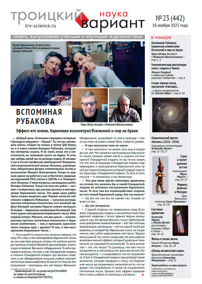 Сегодня в гостях у «Троицкого варианта» профессор швейцарской Федеральной политехнической школы Лозанны, руководитель лаборатории физики элементарных частиц и космологии Михаил Шапошников. Когда-то давным-давно он работал у нас в Институте ядерных исследований РАН, потом в ЦЕРНе и в Университете Лозанны. У меня вопросы, касающиеся работ Валерия Рубакова. Только не всех его работ — начнем с конкретных, про распад протона и несохранение барионного числа. Это даже цикл работ. Здесь можно выделить две. Первая касается собственно «эффекта Рубакова» — катализа распада протона магнитным монополем, этот именной эффект Валерий заслужил будучи совсем молодым. И вторая — барионная асимметрия Вселенной. Там тоже нужно несохранение барионного...