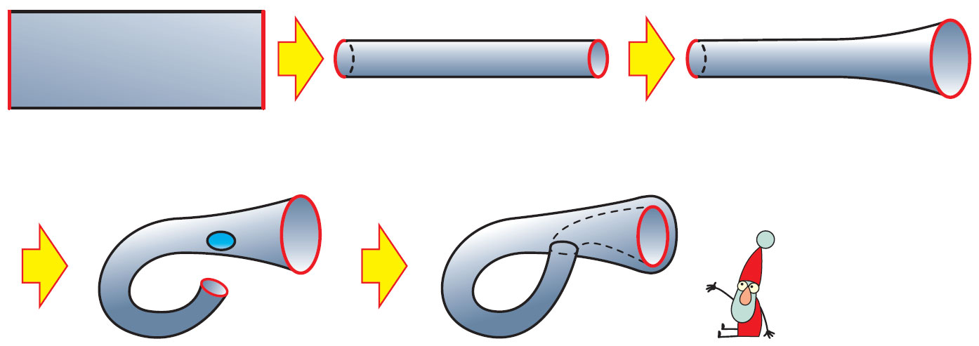 — А я вспомнил про бутылку Клейна1, — сказал Ноутик. — Обычно её делают из прямоугольного листа резины: сначала надо склеить цилиндр, соединив верхнюю и нижнюю стороны. У цилиндра на краях есть окружности, вот я их отметил красным цветом. Цилиндр надо вытянуть, изогнуть как на рисунке, одним концом цилиндра проткнуть стенку, и затем соединить красные окружности.