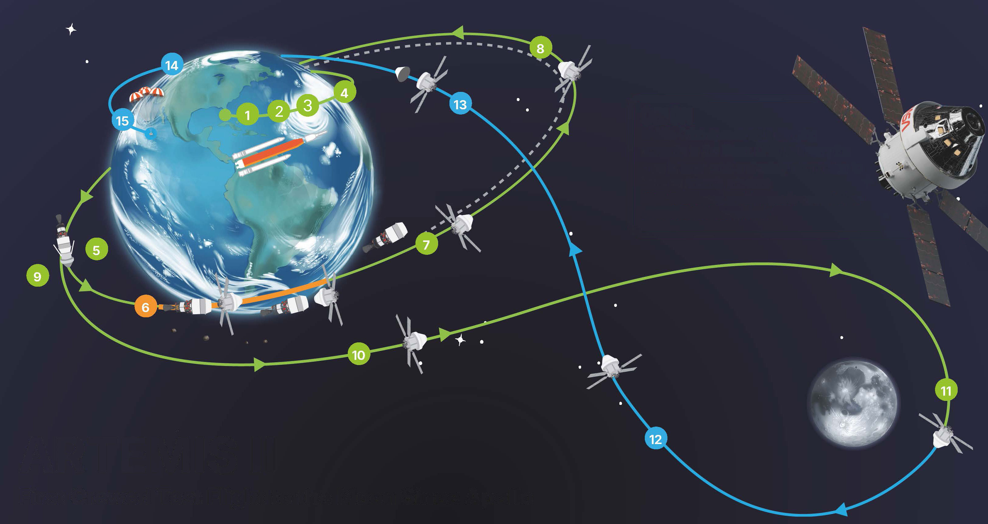 Этапы миссии «Артемида‑2»: 1. Старт. 2. Сброс твердотопливных ускорителей, обтекателей и системы аварийного спасения. 3. Отключение основного двигателя и отделение первой ступени. 4. Маневр повышения перигея. 5. Включение двигателей для перехода на высокую околоземную орбиту. 6. Отделение Orion от временной криогенной ступени (ICPS). 7. Включение двигателей и отделение второй ступени. 8. Включение двигателей для повышения перигея 9. Включение двигателей для повышения перигея. 10. Перемещение на переходно-лунную орбиту с помощью основных двигателей Orion. 11. Пролет Луны. 12. Обратный полет. 13. Отделение модуля экипажа от сервисного модуля. 14. Вход в атмосферу. 15. Приводнение. Источник: NASA