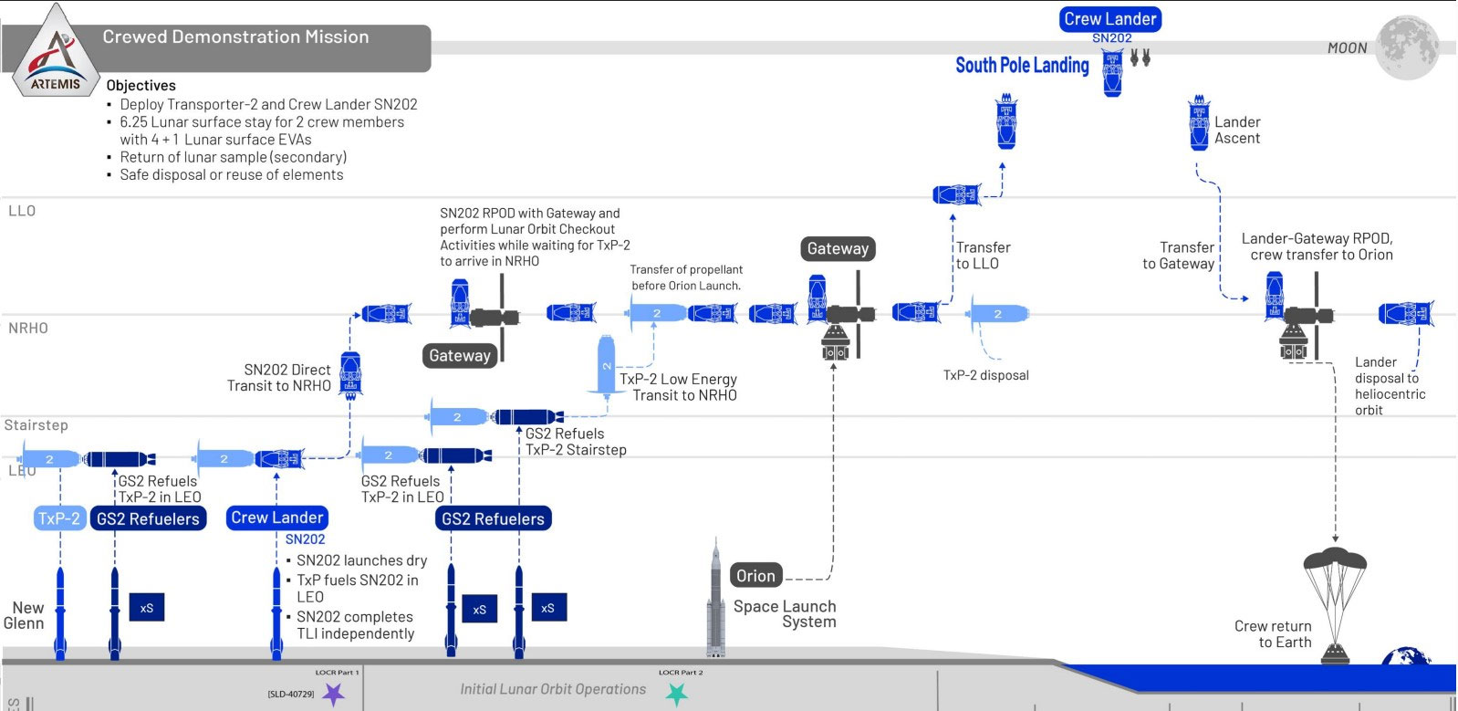 И вот Blue Moon МК2 садится на Луну с двумя людьми, возвращается на орбиту, стыкуется со станцией Gateway, и на корабле Orion астронавты возвращаются на Землю. Вот такая получается схема: пять запусков ракеты New Glenn, чтобы отправить на Луну лунный модуль Blue Moon МК2. И, естественно, он там тоже остается и разбивается о поверхность спутника. И заправщик тоже там остается и тоже разбивается.