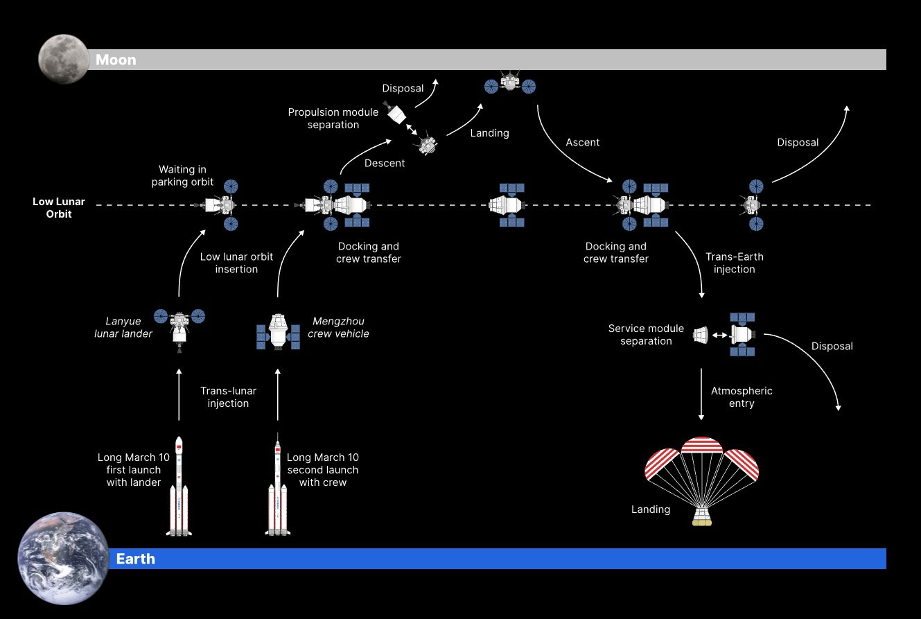 Буквально недавно были проведены испытания первой ступени сверхтяжелой ракеты «Чанчжэн-10» («Великий поход — 10»). Посмотрим на предлагаемую схему полета. Сначала стартует одна ракета, на ней — лунный посадочный модуль и отдельный разгонный модуль. Лунный модуль чем-то похож на советский посадочный модуль, на котором должен был полететь Алексей Леонов. «Ланьюэ» стартует к Луне, используя топливо из разгонного модуля, а на лунном посадочном модуле оно не тратится. Когда эта связка успешно долетает до окололунной орбиты, стартует вторая ракета, на которой находится корабль «Мэнчжоу» с китайскими космонавтами (хантяньюанями).