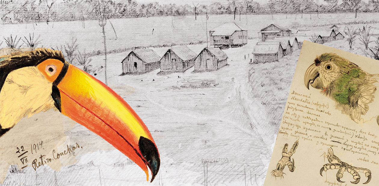 «Villa Kaingang» (Вилья Каинганг, Бразилия). Карандаш. 30 октября 1914 г. Рис. Г. Г. Манизера. СПбФ АРАН. Ф. 985. Оп. 1. Д. 14. Л. 1. Слева — большой тукан (Ramphastos toco). Цветной карандаш. Рис. Г. Г. Манизера. СПбФ АРАН. Ф. 985. Оп. 1. Д. 39. Л. 1