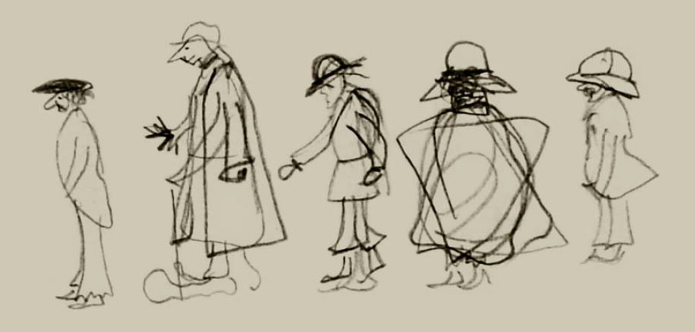 Участники экспедиции в Южную Америку: Г. Г. Манизер, Н. П. Танасийчук, Ф. А. Фиельструп, И. Д. Стрельников, С. В. Гейман. 1914–1915 гг. Карандаш. Шарж Г. Манизера, фрагмент. СПбФ АРАН. Ф. 985. Оп. 1. Д. 50. Л. 12