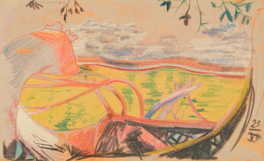 «Индейское каноэ на р. Парана». Цветной карандаш. 23 июля 1914 г. Рис. Г. Г. Манизера. СПбФ АРАН. Ф. 985. Оп. 1. Д. 11. Л. 1