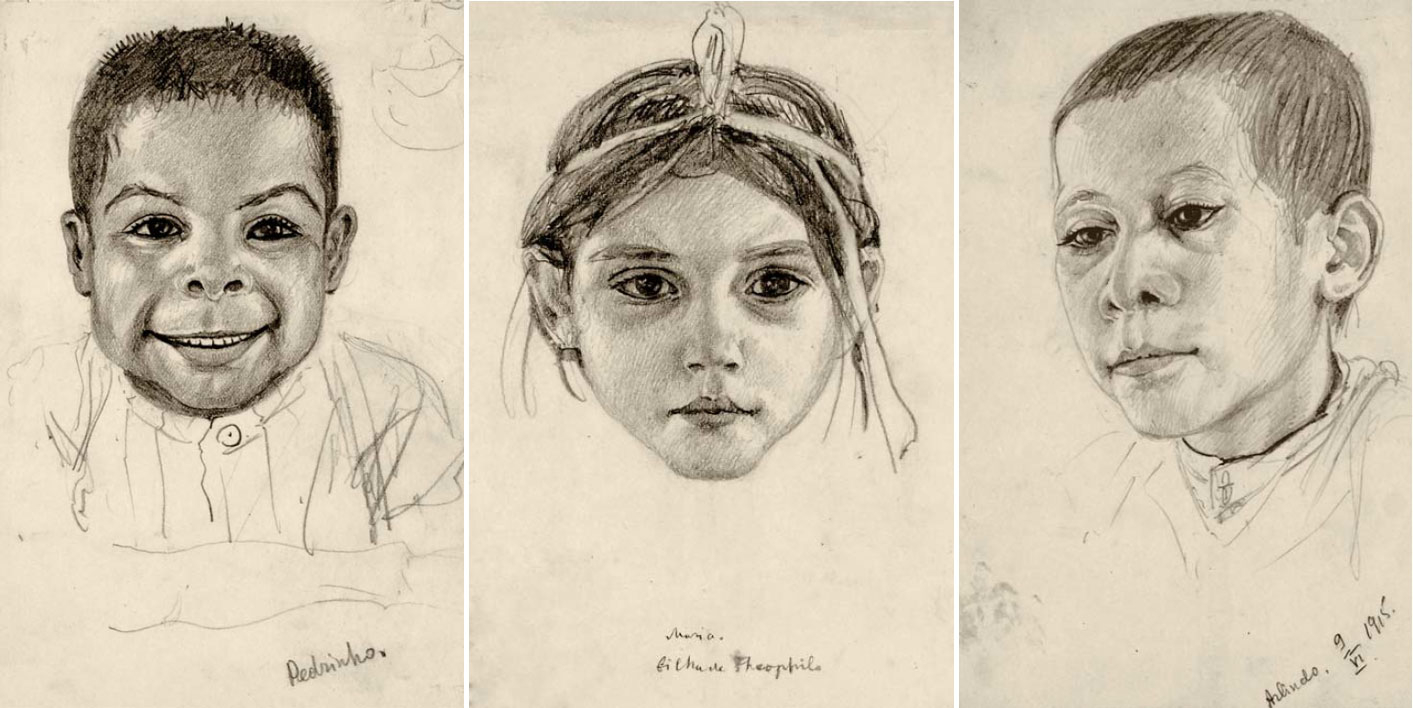 Слева — «Pedrinho» (Педриньо). Карандаш. 1915 г. Рис. Г. Г. Манизера. СПбФ АРАН. Ф. 985. Оп. 1. Д. 31. Л. 1. В центре — «Maria. Filha de Theophilo» (Мария, дочь Теофило). Справа — «Arlindo» (Арлиндо). Карандаш, 1915 г. Рис. Г. Г. Манизера. СПбФ АРАН. Ф. 985. Оп. 1. Д. 38. Л. 1. и Ф. 985. Оп. 1. Д. 30. Л. 1