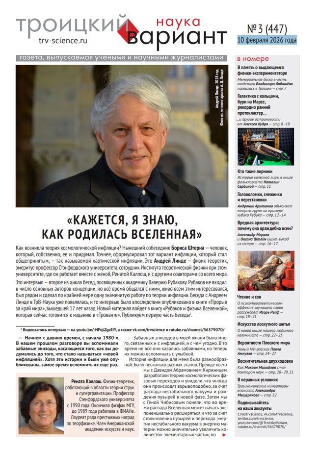 Нынешний собеседник Бориса Штерна — человек, который, собственно, ее и придумал. Точнее, сформулировал тот вариант инфляции, который стал общепринятым, — так называемой хаотической инфляции. Это Андрей Линде — физик-теоретик, эмеритус-профессор Стэнфордского университета, сотрудник Института теоретической физики при этом университете, где он работает вместе с женой, Ренатой Каллош, и с другими соавторами со всего мира. Это интервью — второе из цикла бесед, посвященных академику Валерию Рубакову. Публикуем первую часть беседы.