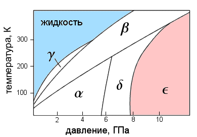 При дальнейшем повышении давления кислород испытывает ряд фазовых переходов, сопровождающихся перестройкой кристаллической решетки. При давлении около 6 ГПа (60 тысяч атмосфер) он превращается в дельта-фазу, сохраняя свой антиферромагнетизм, а при давлении выше 8 ГПа — в совершенно замечательную эпсилон-фазу. Ее также называют красным кислородом из-за насыщенного кроваво-красного цвета (подробнее см. [3]). Наконец, при очень высоком давлении в 96 ГПа (уже за пределами рис. 1) кислород переходит в дзета-фазу и становится сверхпроводником.