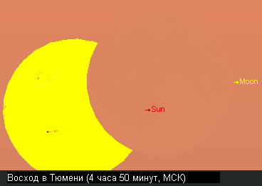 Это значит, что затмившееся восходящее Солнце будет наблюдаться в виде серпа рогами вверх. Весь ход затмения будет виден на территории восточной половины России с убывающими фазами к востоку от Урала. К западу от Урала можно будет наблюдать окончание затмения, а западнее линии Астрахань—Нижний Новгород—Архангельск Солнце взойдет уже при окончании затмения.