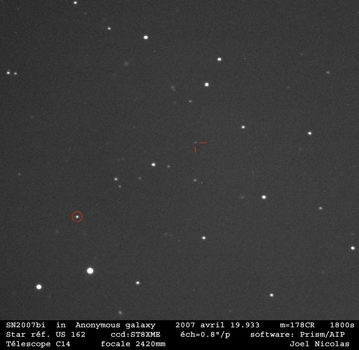 Международная коллаборация астрономов The Nearby Supernova Factory опубликовала результаты анализа более чем полуторагодовых (555 суток) наблюдений сверхновой звезды SN 2007bi, которые велись после ее регистрации в апреле 2007 года. Она вспыхнула в еще не имеющей собственного имени карликовой галактике, расположенной в сравнительной близости от Млечного Пути (величина красного смещения составляет всего лишь около 0,1279). Анализ собранных данных позволяет с достаточной уверенностью предположить, что рождение этой сверхновой обусловлено специфическим механизмом дестабилизации ядра звезды-предшественницы, впервые очерченным в классической работе Уильяма Фаулера и Фреда Хойла (см.: William A. Fowler, F. Hoyle. Neutrino Processes and Pair Formation in Massive Stars and Supernovae // Astrophysical Journal Supplement. 1964. V. 9. P. 201) и вскоре уточненном еще несколькими исследователями.