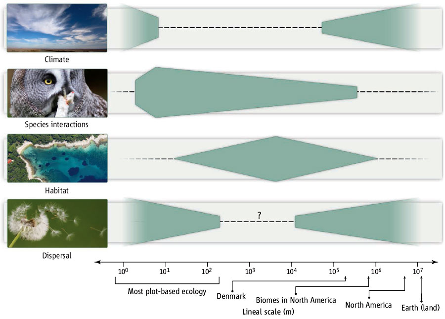 Если законы Ньютона с равным успехом объясняют движение планет и бильярдных шаров, то законы экологии нередко оказываются зависящими от масштаба, то есть работают только в определенном диапазоне расстояний и на определенных отрезках времени. Очевидно, к примеру, что участок земли размером 10 × 10 м2 представляет собой совершенно разное пространство с «точки зрения» бактерии, дождевого червя, полёвки или слона. И дело не только в том, что разное их число может прокормиться и даже попросту поместиться на таком участке. Не менее важна и разная степень гетерогенности для них одного и того же пространства, разное число местообитаний, которые они могут там найти.