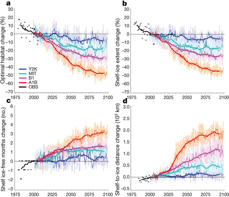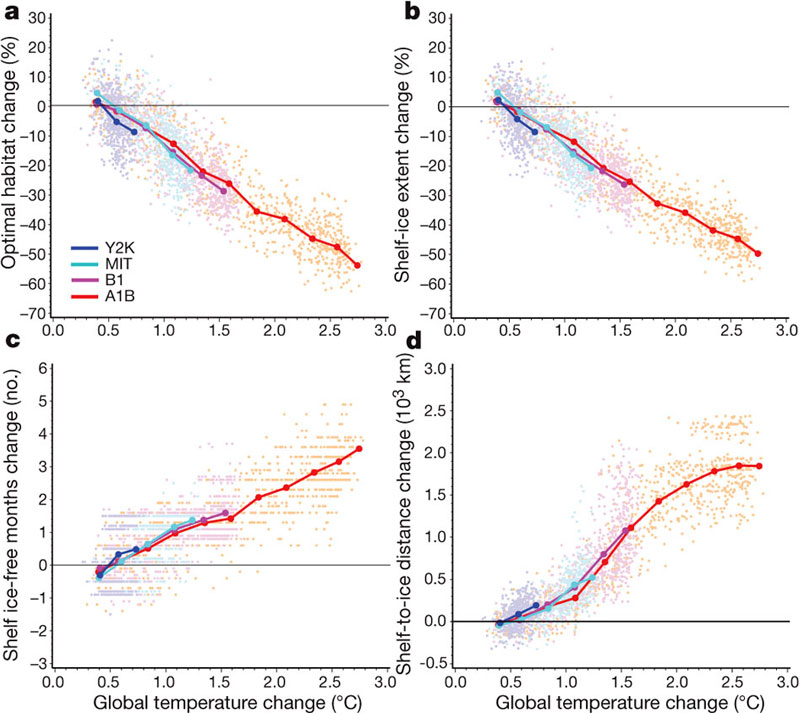 Все связи прослежены в моделях, опирающихся на байесовский подход (см.: байесовская вероятность) и использующих разные сценарии выбросов парниковых газов в атмосферу. Некоторые сценарии предусматривали принятие мер по ограничению эмиссии парниковых газов, другие не предусматривали. Один из сценариев (Y2K) предполагает, что эмиссия парниковых газов останется на уровне 2000-х годов, другой (A1B), что к 2100 году содержание СО2 в атмосфере достигнет 689 миллионных (ppm), а согласно третьему (B1) — 537 ppm. Напомним, что современный уровень — это 382 ppm. Изначально предполагалось, что ответ ледового покрова на повышение температуры воздуха может быть существенно нелинейным, содержащим критические точки; если через них перейти, то обратный путь (восстановление покрова) будет невозможен.