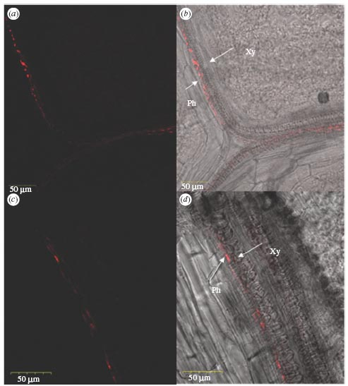 Рис. 2. Флуоресцентная гибридизация in situ двух листьев хлопчатника c использованием зонда, специфичного для гена Pgt. (a, c) Флуоресцентный канал — видны только бактерии, (b, d) наложение каналов — видны бактерии и сами клетки. Видно, что бактерии концентрируются только во флоэме. Ph — флоэма, Xy — ксилема. Изображение из обсуждаемой статьи в Proceedings of Royal Society B