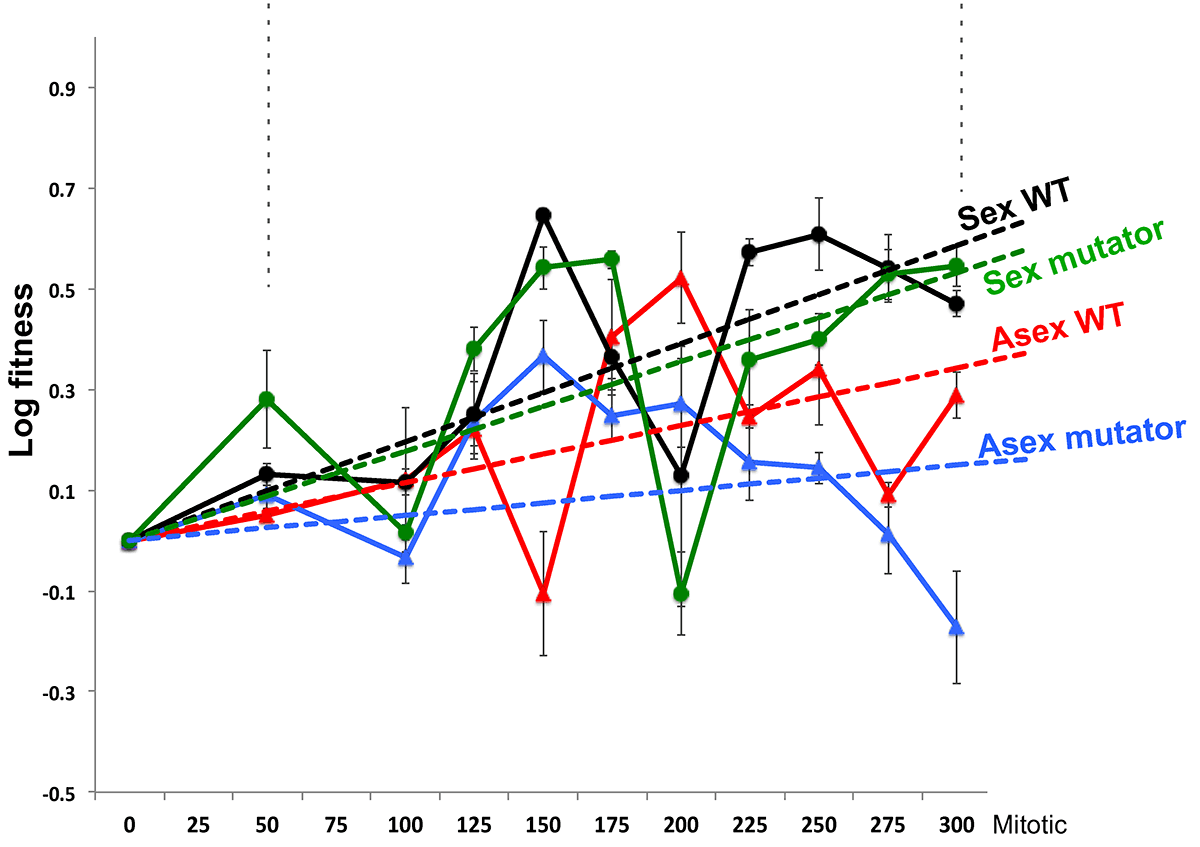 Рост приспособленности в череде поколений свидетельствует о накоплении полезных мутаций. Очевидно, в неблагоприятных условиях случайные мутации действительно оказываются полезными чаще, чем в оптимальных. Эксперимент подтвердил, что половое размножение повышает эффективность положительного отбора, помогая накапливать полезные мутации. Это видно из того, что обычные дрожжи приспособились к стрессовым условиям лучше, чем бесполые (черная и зеленая пунктирные линии на рис. 3 проходят выше, чем красная и синяя).