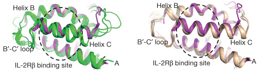 Рис. 3. Различия в структуре между интерлейкином 2 (слева) и суперкином D10 (справа). Показаны три самых частых варианта конформации для каждого белка, наложенные на конформацию белка, связанного с рецептором. Видно, что C‑спираль у суперкина «шевелится» гораздо меньше, чем у обычного интерлейкина. Изображение из обсуждаемой статьи Aron M. Levin et al. в Nature
