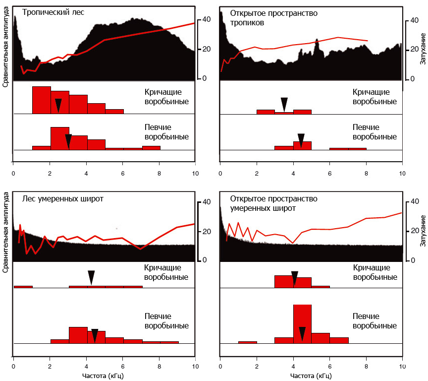 Канадские и американские зоологи показали, что певчие птицы тропических лесов поют на более низких частотах и в более узком частотном диапазоне, чем птицы умеренных широт. Это явление ученые объясняют в основном тем, что в тропическом лесу гораздо выше уровень высокочастотного шума, издаваемого поющими насекомыми, и, кроме того, сильнее затухание высокочастотных сигналов, чем в лесах умеренных широт. Эволюционные расчеты свидетельствуют, что частотные характеристики птичьих песен в тропических лесах меняются медленнее, чем частотные свойства песен у птиц в умеренных широтах.