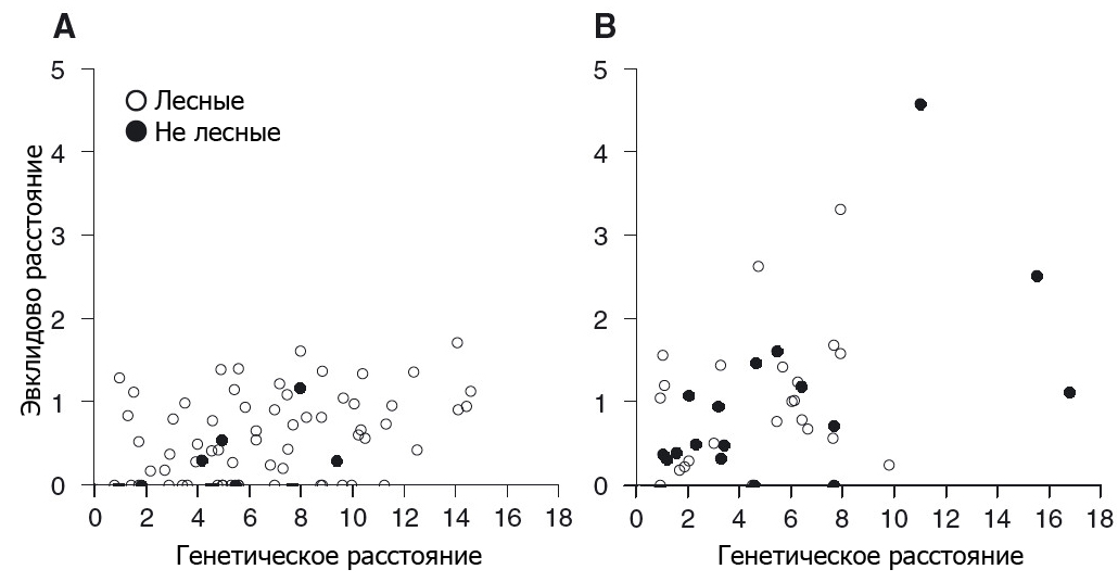 Рис. 3. Зависимость различий песен по частотным характеристикам (евклидово расстояние) от степени родства (генетического расстояния) видов певчих птиц из тропиков (0°–23°) (А) и из умеренных широт (23°–66°) (В). Изображение из обсуждаемой статьи в Evolution
