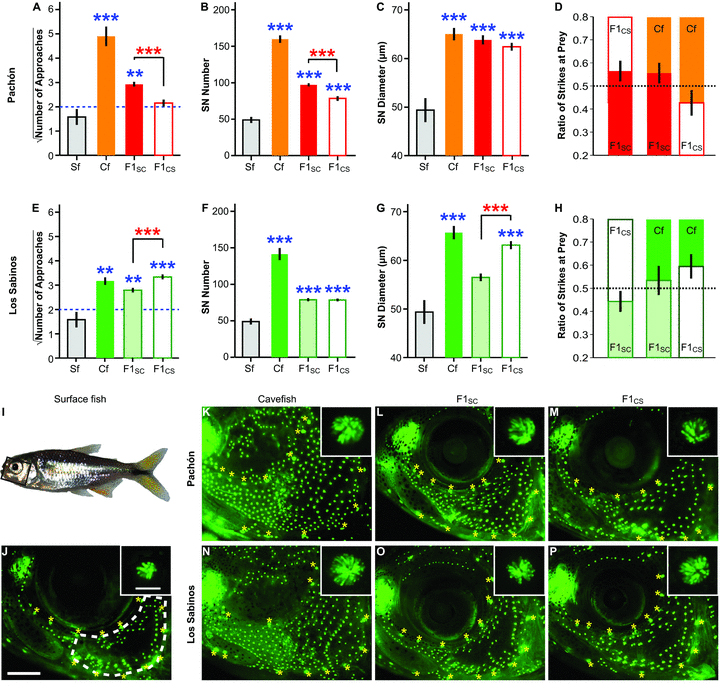 Рис. 1. A–H. Влияние родительских генетических эффектов на различные параметры: наследование локомоторного поведения, вызываемого вибрацией (А, Е), число нейромастов (В, F), размер нейромастов (C, G) и интенсивность клевания источника вибрации (D, H) у рыб A. mexicanus. Sr — зрячая форма, Cr — слепая пещерная форма, F1SC — потомство от зрячей матери и слепого отца, F1CS — потомство от слепой матери и зрячего отца. I–P. Исследование нейромастов. I — изображение зрячей рыбы, область на голове, обведенная черным прямоугольником, изображена далее на J–P. J — окрашенные флуоресцентной краской нейромасты на голове зрячей формы. K, N — нейромасты на голове пещерной формы. L, M, O, P — нейромасты на голове гибридов. Изображение из обсуждаемой статьи в Evolution