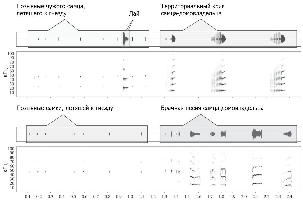 Вверху: осцилограммы (сверху) и спектрограммы (снизу) эхолокационных сигналов подлетающих самцов и стационарного самца, находящегося на месте дневки: слева в рамке – эхолокационный сигнал приближающегося самца, на который наложился отрывистый «лай» самца-домовладельца, который продолжился его территориальным криком (справа в рамке). Эти характерные узоры сигналов и ответов самцов в целом единообразны, хотя немного варьируют от места к месту и от семьи к семье.